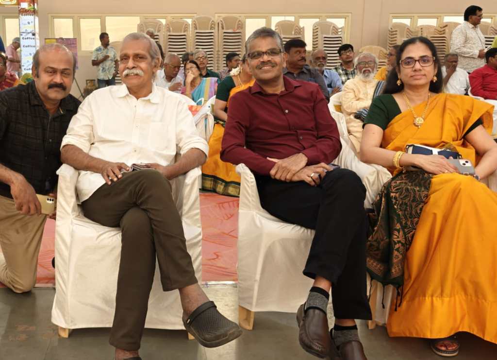 இன்று எல்லாவற்றையும் நேருக்கு நேர் பார்த்து விடுவது என்று ராதா, முதல் வரிசை நாற்காலிகளில் நட்ட நடு நாயகமாக இருந்த ஒன்றில் அமர்ந்துகொண்டு இன்னொரு நாற்காலியில் தனது கைப்பையை வைத்துக்கொண்டார். நண்பர்களைக் கண்டால் ஓடிவிடும் எனக்கு ரிசர்வ் செய்ய அந்தப் பை. கொஞ்சம் தள்ளி நின்றிருந்த ஜெயமோகன், எழுத்தாளர்கள், ஆளுமைகள் வந்தால், என்னையும் ராஜனையும் கூப்பிட்டு நிறுத்தி அறிமுகப்படுத்தினார். இல்லையென்றால் கீரனூர் ஜாகிர்ராஜா-வெல்லாம் நான் அடையாளம் கண்டிருக்கமாட்டேன். குருஜி சௌந்தர் இன்றுதான் வந்திருந்தார். தனது யோகா குருவை நேரில் பார்த்ததில் ராதாவிற்கு மிக்க மகிழ்ச்சி. கொஞ்சம் தொலைவில் நின்றிருந்த , கவிதா என்னை பார்த்து , ‘நீங்கள்.. க. நா. சு. உரையாடல்’ என்று புன்னகை செய்துவிட்டு, ராதாவின் பக்கம் கையை காட்டி உங்கள் மனைவியா என்றார். கதிரை குடும்பத்துடன் பார்த்தேன். அவரது மகள் இவனை நம்பலாமா சிரிக்கலமா என்று பார்த்தாள்.