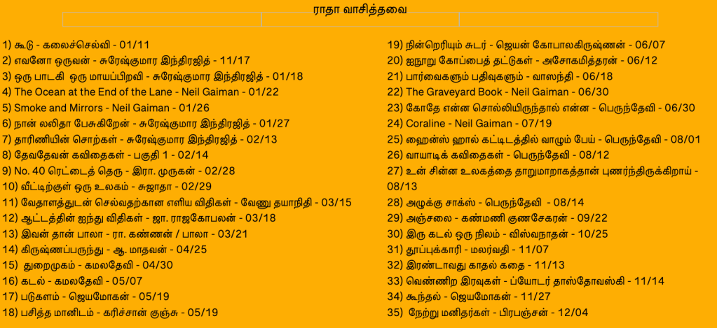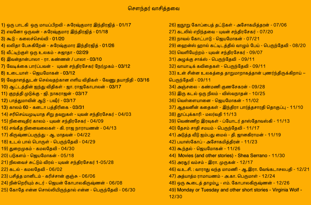 அ. முத்துலிங்கம் அவர்கள் , “வாசகர் தேவை” என்ற கட்டுரையில், “ஜே.கே. ரோலிங்க் எழுதிய புத்தகங்கள் 400 மில்லியன் உலகம் முழுக்க விற்றிருக்கின்றன. எத்தனை பேர் புத்தங்களை வாசித்தார்கள். எத்தனை பேர் பாதிவரை படித்து மூடிவைத்தார்கள். எத்தனை பேர் தொடவே இல்லை போன்ற கணக்கெடுப்புகள் இல்லை. “ என்று குறிப்பிட்டிருப்பார். ராதாவும் நானும் நாங்கள் வாங்கியதை வாசித்ததை 2016-லிருந்து பட்டியிலிட்டுக் குறித்து வைத்திருக்கிறோம். ஒவ்வொரு வருட இறுதியிலும் வாசித்த அட்டவணையை நண்பர்களுக்குத் தெரிவிக்கிறோம். இந்த வருடம் கொஞ்சம் தாமதம். தாமதமானாலும், பொதுவெளியில் எங்கள் வாசிப்புக் கணக்கை அறிவிக்காவிட்டால், அ. முத்துலிங்கம் அவர்களின் மேற்கண்ட வாசகம் தலைக்குடைச்சலாகிவிடும். 101 மந்திரங்கள் சொல்லலாம். 101 புத்தகங்களை வாசிக்கமுடியுமா என்ன? இதற்கு முந்தைய வருடங்களில் வாங்கிய புத்தகங்களும் போட்டிக்கு உள்ளன. என் பங்கிற்கு 49 புத்தகங்களும், ராதா பங்கிற்கு 36 புத்தகங்களும் வாசித்துள்ளோம்.