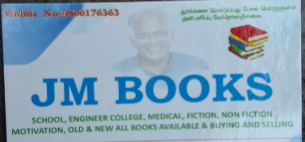 “நண்பர்களுக்கிடையில் புத்தகம் வாங்கிக் கொடுப்பதற்கு எல்லாம் எதற்கா காசு “ என்று பிடிவாதம் பிடித்தார். அவர் JM Books என்ற புத்தகக்கடையை திருவல்லிக்கேணியில் ஒரு நல்ல வாசகனாக நடத்தி வருபவர். நான் மேலும் மேலும் அழுத்தம் கொடுக்க 900 ரூபாய் வாங்கிக்கொள்ள ஒப்புக்கொண்டார்.