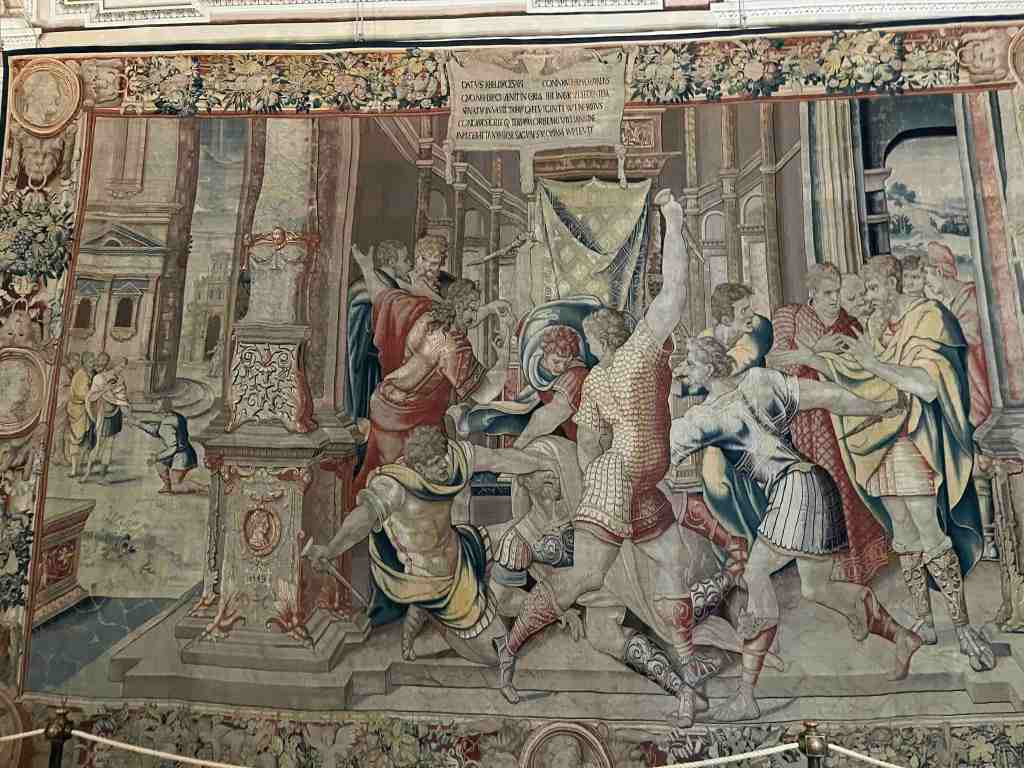 திரைச்சேலையில், இந்தக் காட்சி அரிதாகவே உருவாக்கப்படுகிறது, இது சீசரை நான்கு கொலையாளிகள் தாக்கும் தருணத்தைக் காட்டுகிறது. அந்த நேரத்தில் மற்ற செனட்டர்கள் இருபுறமும் பார்த்துக் கொண்டிருக்கிறார்கள். வலதுபுறத்தில் தூண்களுக்கு இடையில் ஒரு நிலப்பரப்பு தெரியும். இடதுபுறத்தில் படுகொலைகளுக்கு உடனடியாக முந்தைய ஒரு சம்பவம் தோன்றுகிறது. ஆர்டெமிடோரஸ் சீசருக்கு எதிரான சதித்திட்டத்தை எச்சரிக்க முயற்சிக்கிறார். இந்த திரைச்சீலை பழங்கள் மற்றும் இலைகளின் கனமான மரக்கட்டைகளால் அலங்கரிக்கப்பட்ட ஒரு பரந்த எல்லையால் வடிவமைக்கப்பட்டுள்ளது, அவற்றில் நிர்வாண குழந்தைகள் விளையாடுகிறார்கள்.