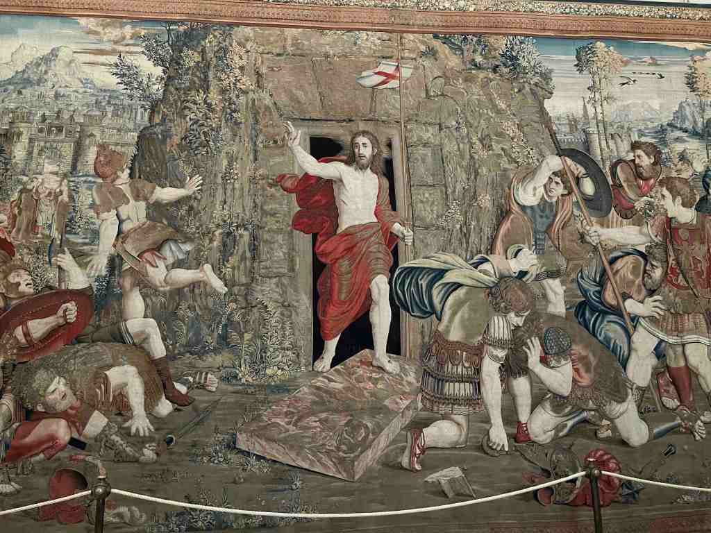 இந்த ஓவியம் கிறிஸ்துவின் உயிர்த்தெழுதலைக் குறிக்கிறது, அவர் கல்லறையிலிருந்து வெளிப்பட்டு ரோமானிய நூற்றுவர் தலைவர்களைப் பயமுறுத்துகிறார். இந்த ஓவியம், ஆக்ஸ்போர்டில் உள்ள ஆஷ்மோலினா அருங்காட்சியகத்தில் ஜியோவன் பிரான்செஸ்கோ பென்னி (1490-1528) வரைந்த மூலங்களின் நகல்களாகத் தெரிகிறது. ஆனால் இதை காட்சிப்படுத்தப்பட்டிருக்கும் பாணியின் காரணமாக இதை வரைந்தவர் கிலியோ ரோமானோவாக இருக்கலாம்.